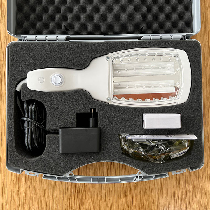 La lampe portative UVB Dermfix 2000SX est un appareil unique de photothérapie UVB à domicile qui permet de traiter le psoriasis, le vitiligo et l'eczéma atopique sur toute la surface du corps. L'appareil est équipé en standard de tubes UVB 311nm à bande étroite spécialement développés.